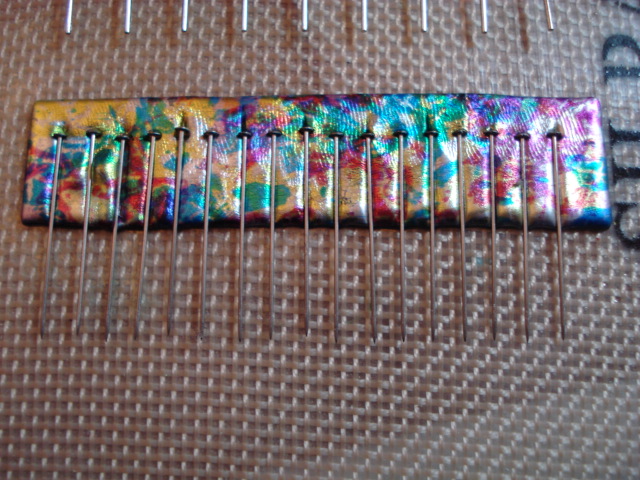 I laid down Amaco's comb and cut a strip of Friendly Plastic the same size, and laid heavy duty straigt pins across it. Not sure how this would come out, I decided to set them half way up the plastic as I didn't want them moving when I use the tool.