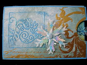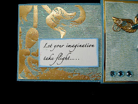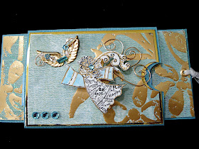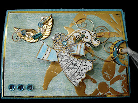 After Susan went home, I decided to try and come up with the measurements to do this as an ATC sized card so I could put it in my ATC rounder with all my other Creative Technique Cards. Oh! How fun!!! I simply used leftover scraps of paper for this one. The angel is done in white shrink plastic that I colored with watercolor pencils and 14K gold krylon pen. Lots of gold metallic on this piece with turquoise rhinestones.