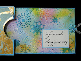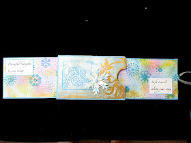 And added a few rhinestones. The snowflake brad is from Creative Impressions and I used the airbrush to get matching colors and then added glitter on top of that. All closed up, this card measures about 5 1/2" x 3 1/2" and when you open it, it goes to almost 14" long!