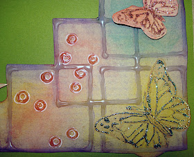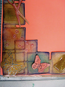 I cut out the inside and outside borders, inked it up, and then started layering product and colors and mediums on top. But what we found most amazing is what you can do with the final product. Here it is on coral....