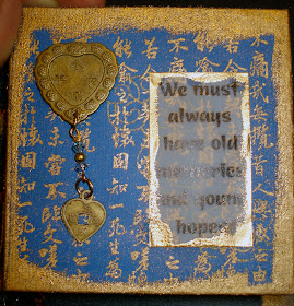 Mine had an oriental flair ot it, so I used a text background and gold embossing powder over the stamp and around the edges, then cut out a sentiment that was printed on vellum and inked and embossed the edges of it. Then I stuck a couple of swarovsky crystals on wire and attached 2 hearts together. I would have finished this a whole lot earlier, but it's just been a busy and fun week!