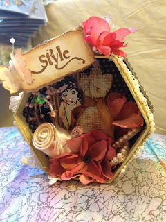 Tim's dressform, Judi's stamps, corrigated cardboard, pearls, sequens, stickles, distress ink.....